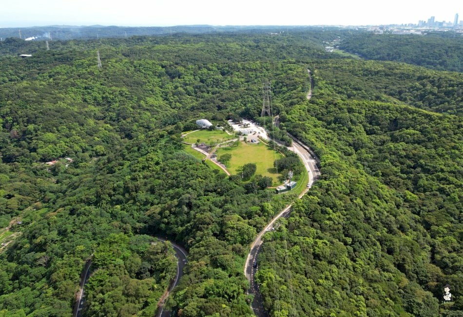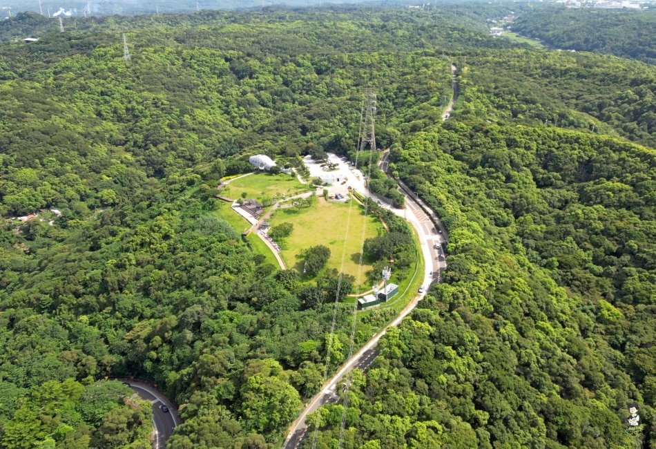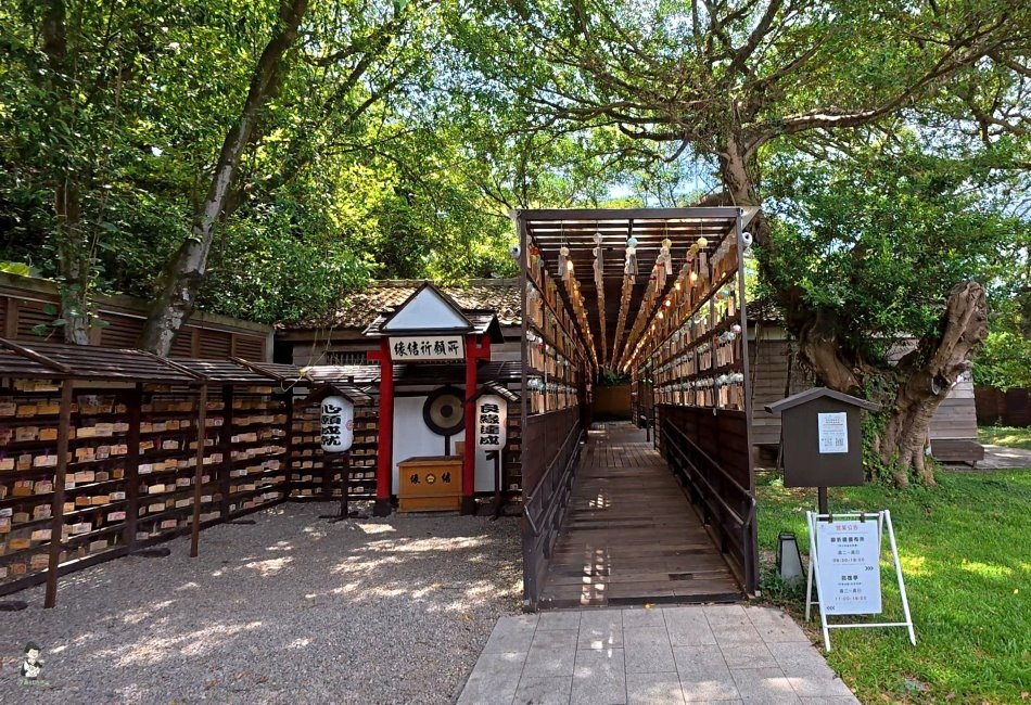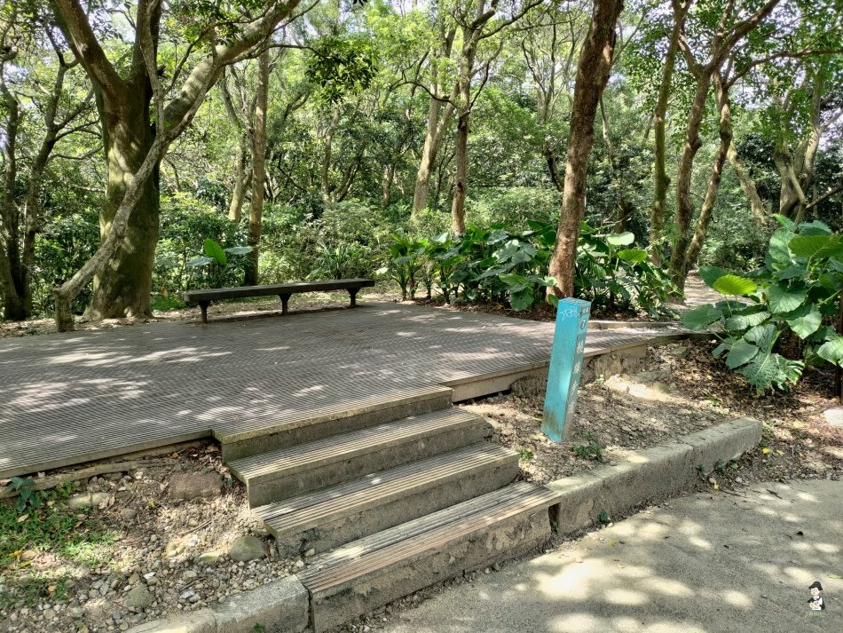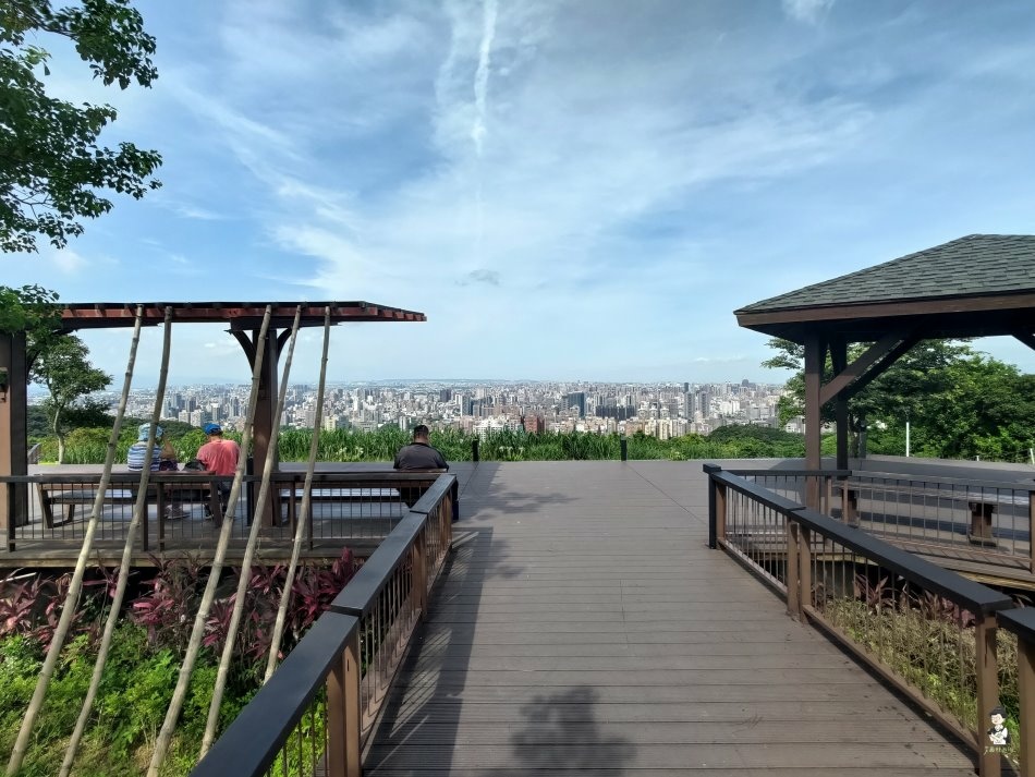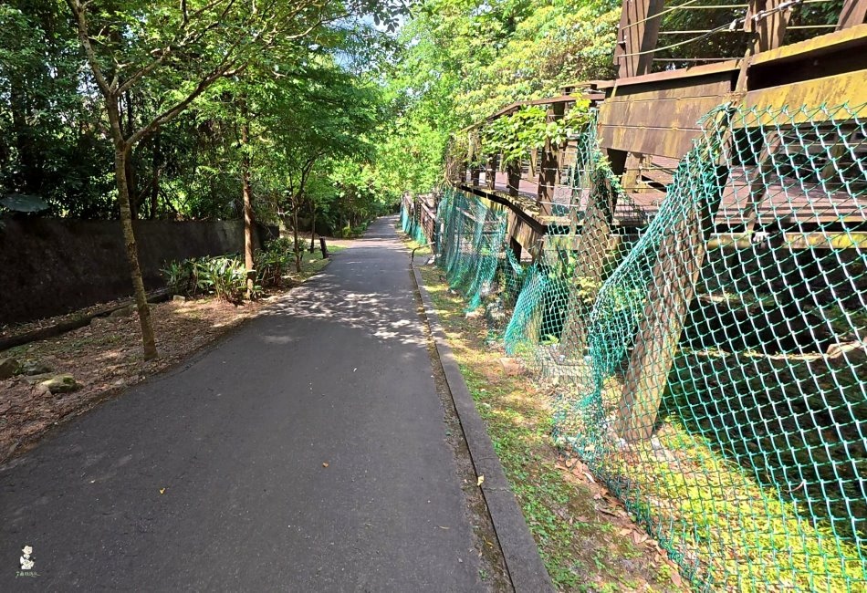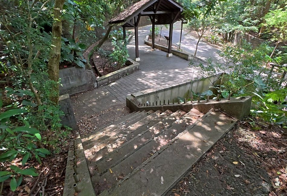 步道口還有一處涼亭, 沿著右邊的木棧道或是柏油路下行約500公尺就可以到達桃園神社