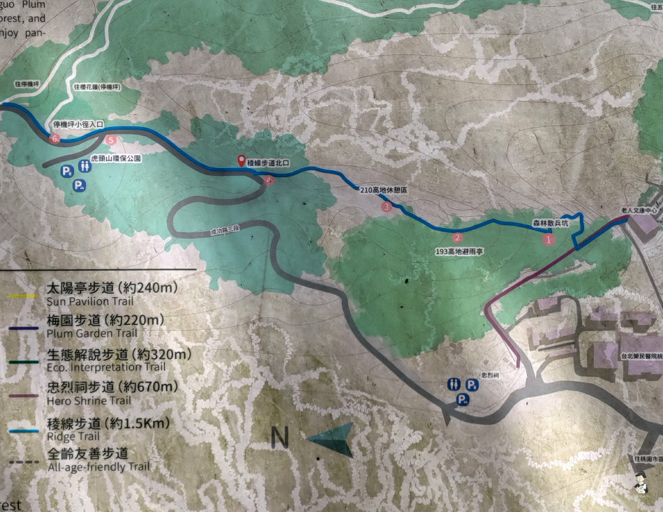從環保公園走稜線步道到忠烈祠步道交會點約990公尺, 再走忠烈祠步道到桃園神社總長約1.5公里