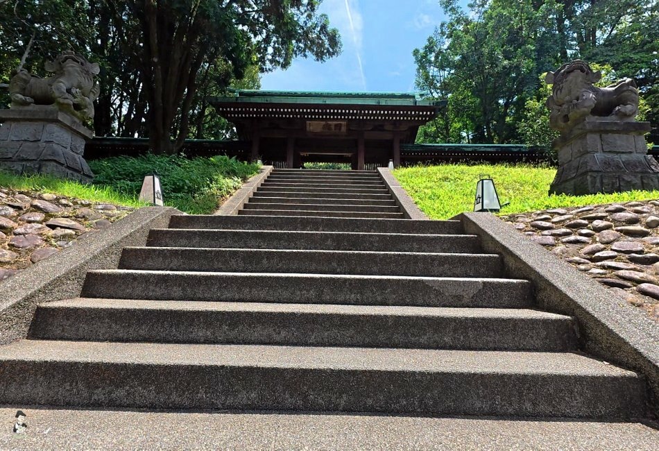 主殿前的階梯平台稍做停留, 可居高臨下眺望整個神社景致, 感受被綠意所包圍的靜謐氛圍
