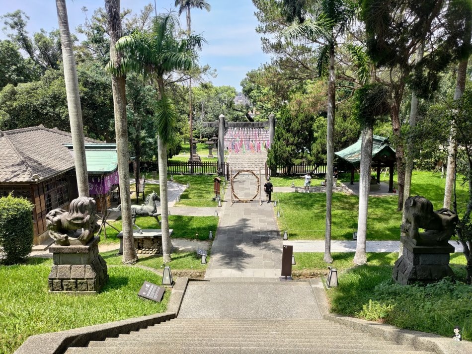 木棧道最後下行到成功路三段上可以從桃園神社入口進, 或是右岔路直接進到桃園神社廣場